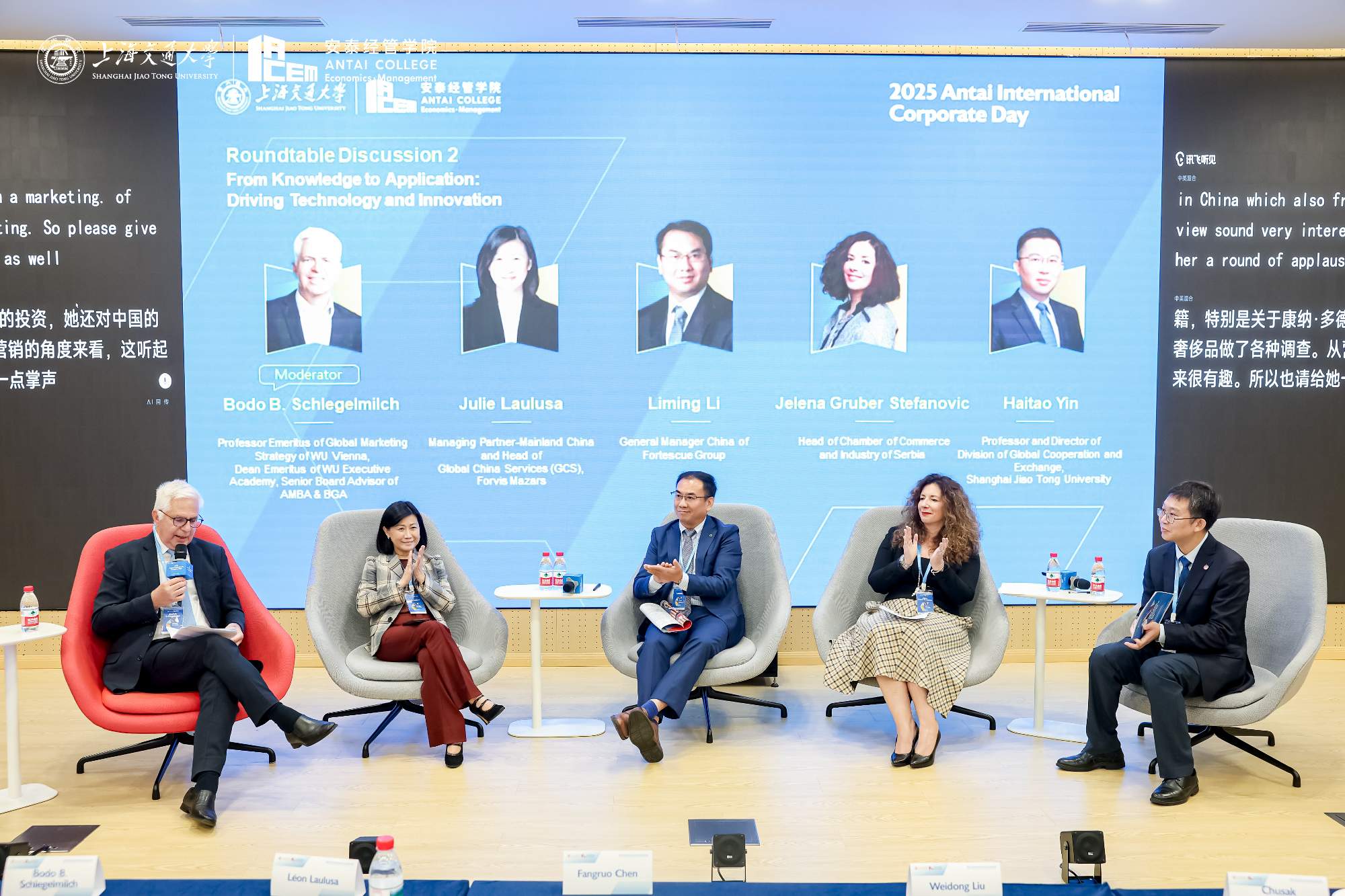 The second roundtable, themed “From Knowledge Transformation and Technological Innovation,” was moderated by Professor Bodo B. Schlegelmilch, Professor Emeritus of Global Marketing Strategy at WU Vienna, Dean Emeritus of the WU Executive Academy, and Senior Advisor to AMBA & BGA. Participants included Mr. Liming Li, General Manager China of Fortescue Group; Dr. Julie Laulusa, Managing Partner Mainland China and Head of Global China Services (GCS), Forvis Mazars; Ms. Jelena Gruber Stefanovic, Head of the Chamber of Commerce and Industry of Serbia; and Professor Haitao Yin, Director of the Division of Global Cooperation and Exchange at SJTU. The discussion focused on how cutting-edge research can be effectively transformed into technological innovation, emphasizing interdisciplinary collaboration, knowledge transfer, and successful examples of university–industry partnerships that promote innovation and entrepreneurship.